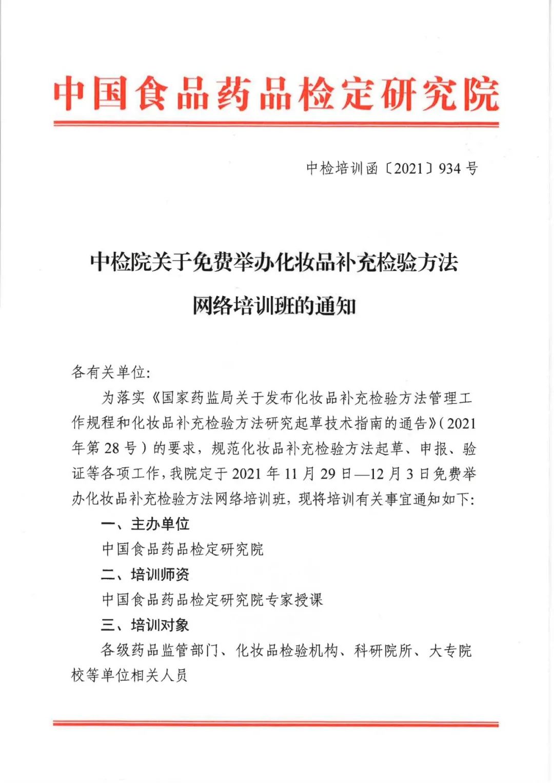 中檢院關(guān)于免費(fèi)舉辦化妝品補(bǔ)充檢驗(yàn)方法網(wǎng)絡(luò)培訓(xùn)班的通知