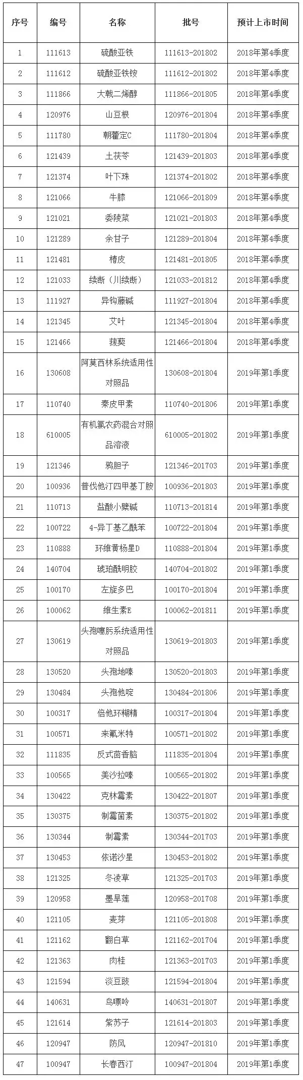 ? ? 2018年第十一期國家藥品標準物質供應新情況,包括47個即將換批品種的預計上市時間、47個即將失效品種的有效使用期限和2個停用品種名單。